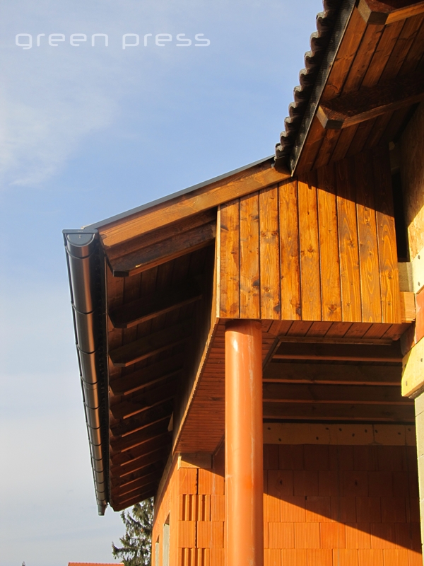 Nem az a fázisa zajlik a munkának, amikor naponta történik valami látványos és szembetűnő, de azt kiszúrtam, hogy majdnem teljesen kész az ereszcsatorna. Kifejezetten jól mutat, hogy nem a szokványos bádoglemezből készült, hanem a cserepek színével azonos sötétszürke árnyalatúból. Ugyanilyen sötét bádoglappal fedték be az oromfalak tetejét, és egy helyen a tetőrészek közötti törésvonal oldalát is. Nem mi kértük a színazonosságot, valójában eszünkbe sem jutott a bádogelemekkel foglalkozni, a kivitelezést koordináló építészünk volt ilyen figyelmes.