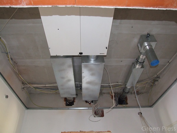 Megérkezett a szellőztető berendezés Ausztriából. A fiúk könnyedén felrögzítették a helyére, a gépészeti helyiség mennyezetére, a villamos bekötés azonban okozott némi fejtörést a villanyszerelőknek. A nehézséget végül leküzdötték, a gép a helyén van, és mentségükre legyen mondva, hogy ők aztán hihetetlen rugalmassággal állnak minden módosításhoz. Szemrebbenés nélkül válogatják az általam rendelt, lehető legbonyolultabb villamos alkatrészeket, vésnek újra, ha kérem, és segítenek mindenben, amiben lehet. Kérésünkre még Illbruck pasztát is nyomtak a szerelvények mögé, elősegítendő, hogy a kábelek mögötti réseken se szökjön a levegő. Nem lehet rájuk panasz.